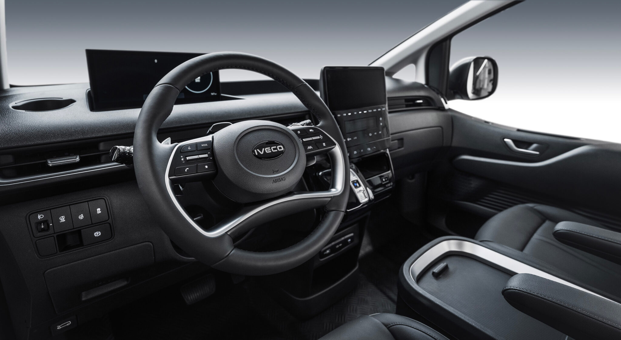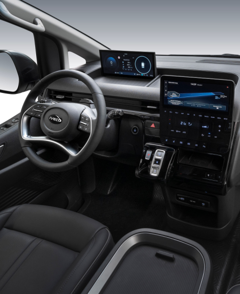 The IVECO eMoovy's cab offers a luxurious and functional work environment, featuring an elegant and well-appointed dashboard.
