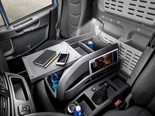 Ndarje për ruajtjen e objekteve dhe dokumenteve, ndarje specifike për karta dhe një varëse rrobash në murin e pasmë të kabinës. Konsola qendrore e shoferit përmban dy mbajtëse praktike shishesh, një dalje 12 volt dhe (me kërkesë) një lidhje për ajër të kompresuar. Dy lidhje USB janë të disponueshme standard në panelin e përparmë.