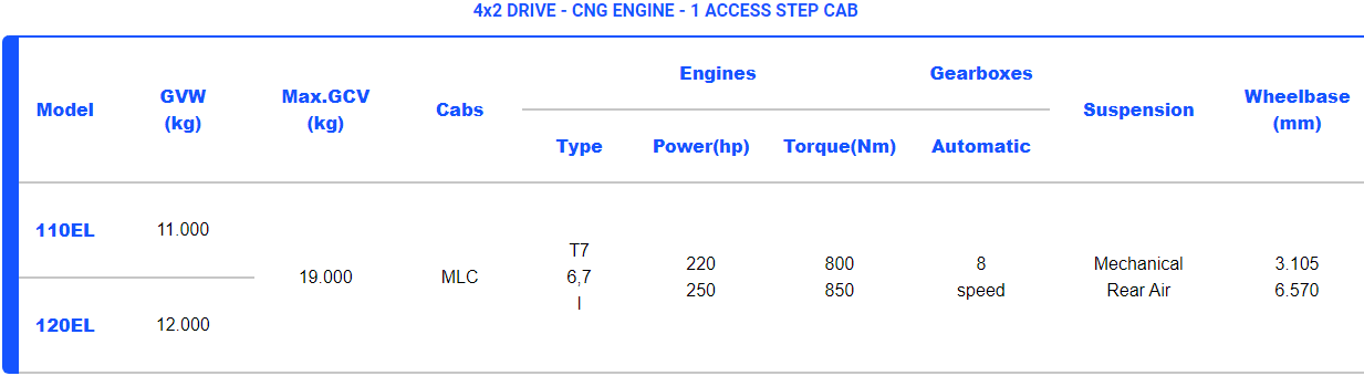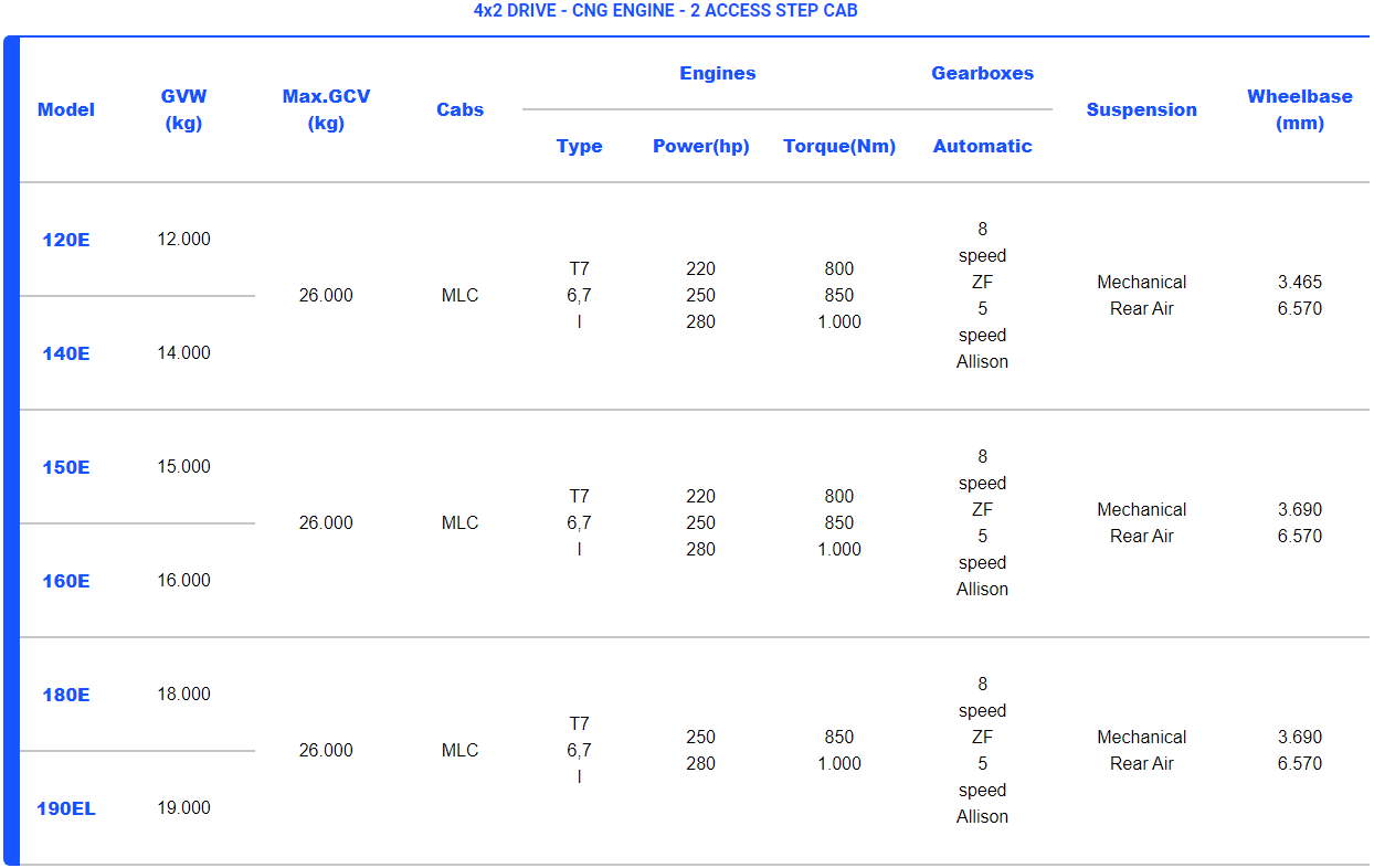 Masa totale bruto e automjetit prej 11.5, 12 ose 15 tonësh me motor Tector me gjashtë cilindra dhe një përzgjedhje variantësh me 250, 280 dhe 320 kuaj fuqi.