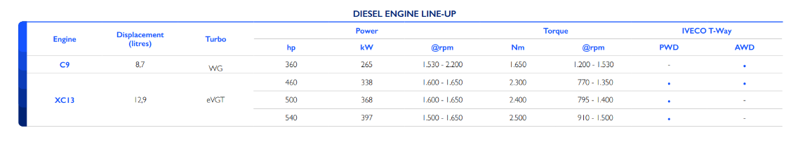 Oferta përfshin një përzgjedhje motorrësh me dy cilindra aktivë – 9 dhe 13 litra – për të siguruar fuqinë dhe moment rrotullimi ideal për çdo mision.