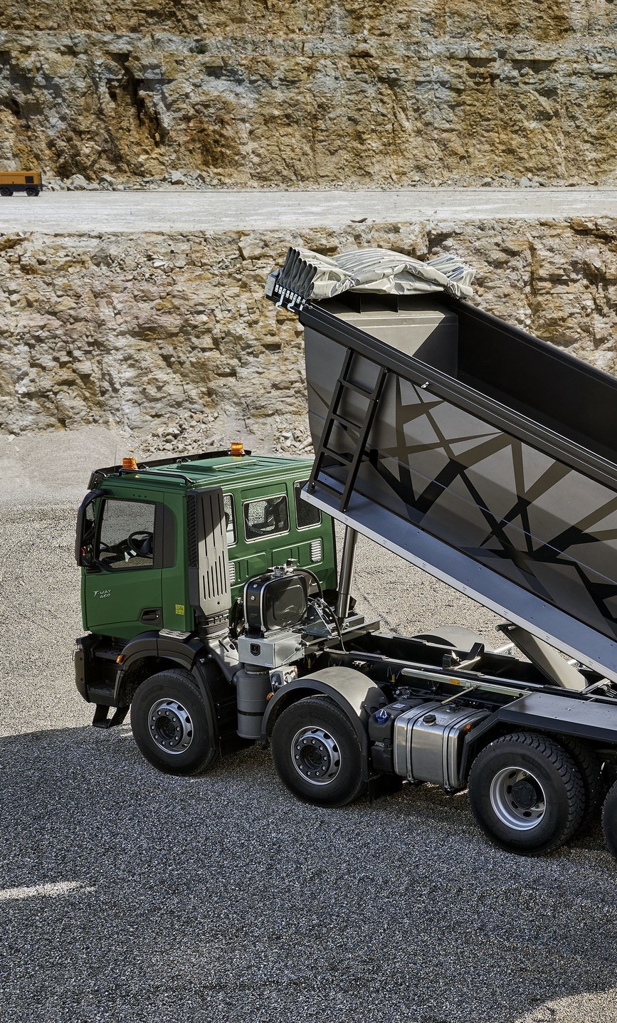 Falë shasisë së fortë dhe optimizimit të peshës, IVECO T-Way është projektuar për t’u pajisur me karroceri vetëshkarkuese me kapacitet të lartë për të transportuar ngarkesa të mëdha.